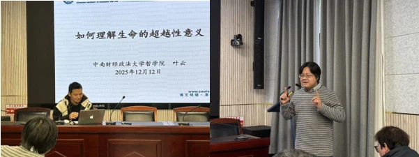 最后一场由哲学院副教授叶云发言,题目为“如何理解生命的超越性意义”。叶云开篇提出观点,认为生命的价值、意义涉及一个个体性和超越性的问题。超越可以有两种,一是外在超越,二是内在超越,有两条路径,一是宗教路向,二是人文路向。生命的价值、意义应该说不是通过理性思考思出来的,而是感受出来的。通过麦金泰尔的《追寻美德》,他列举出未受教化的人性、伦理学上的训诫和实现其目的而可能所是的人性三点,并联系康德的文本讨论人性中的善。王阳明说过,良知是生命的定盘针,叶云指出,礼乐习俗等对中国人来说不是可有可无的,中国强调性善论,性善论依然是主流论调,人是一种道德的存在,他接着用种喻来说明这一点,他强调,人是一种先天的道德存在。叶云在最后联系起当代年轻人的现实情况,提出现代人该如何归家的问题,并指出世俗生活的神圣性,要说不圆满,永远都不圆满,但要说圆满,当下即可圆满。
