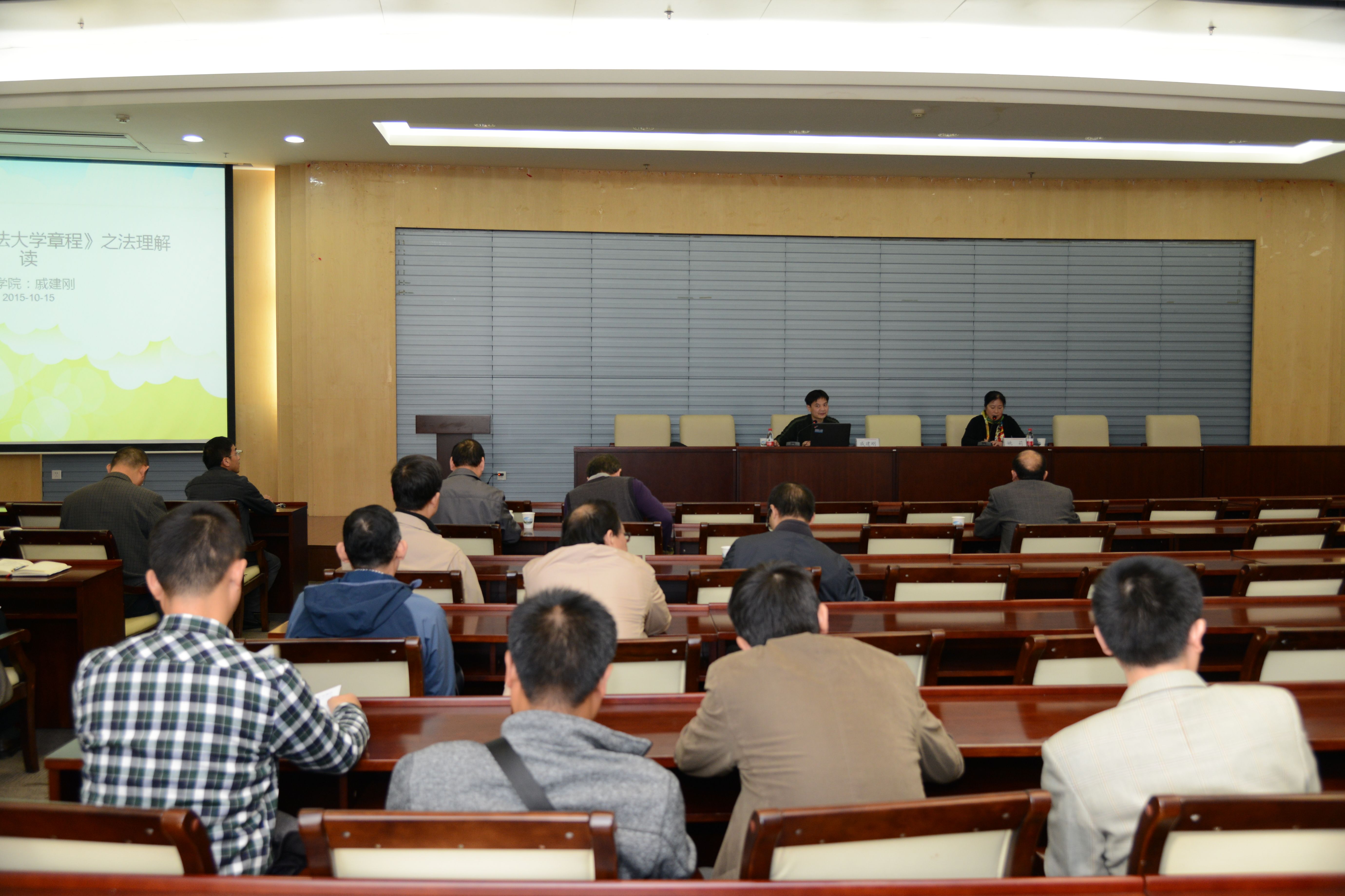 2015年11月5日下午,为了使我校全体教职员工了解、熟悉学校章程,进一步学习章程的法治精神和重要作用,学校开展了章程的普法学习会。法学院行政法专家、博士生导师戚建刚教授作了题为《<米兰电竞·(中国区)章程>的法理解读》的普法讲座,姚莉副校长主持此次普法学习会,雷兴虎主任做总结发言。