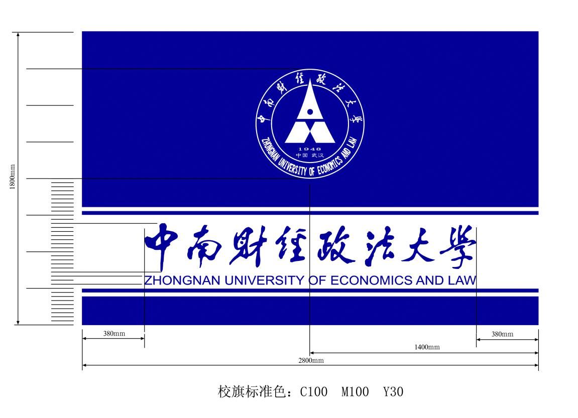 第七十四条 学校校旗为蓝白二色和绿白二色两种。校标置于旗帜上方中央,蓝底或绿底反白。邓小平题写的中文校名与学校英文校名为蓝字或绿字白底,上下各有一蓝色或绿色装饰条。校旗标准尺寸为宽2800mm,高1800mm。具体图案、制作规格、色彩分布如下: