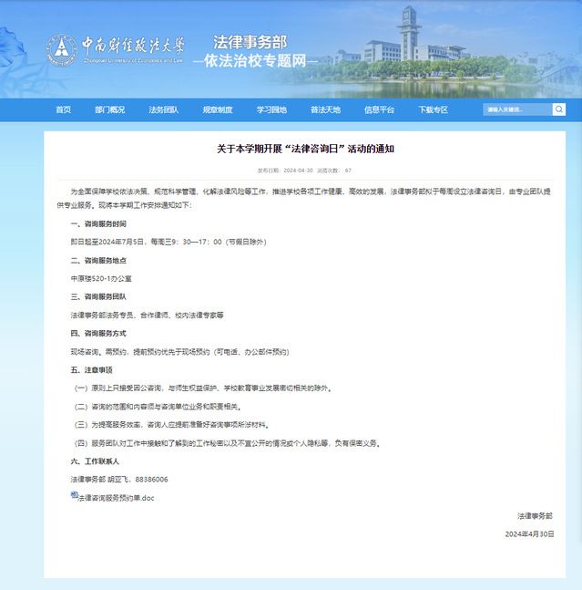 今年5月起,法律事务部将每周三设为“法律咨询日”,学校法治工作合作律所律师到校轮班值守,为师生员工提供免费法律咨询服务。