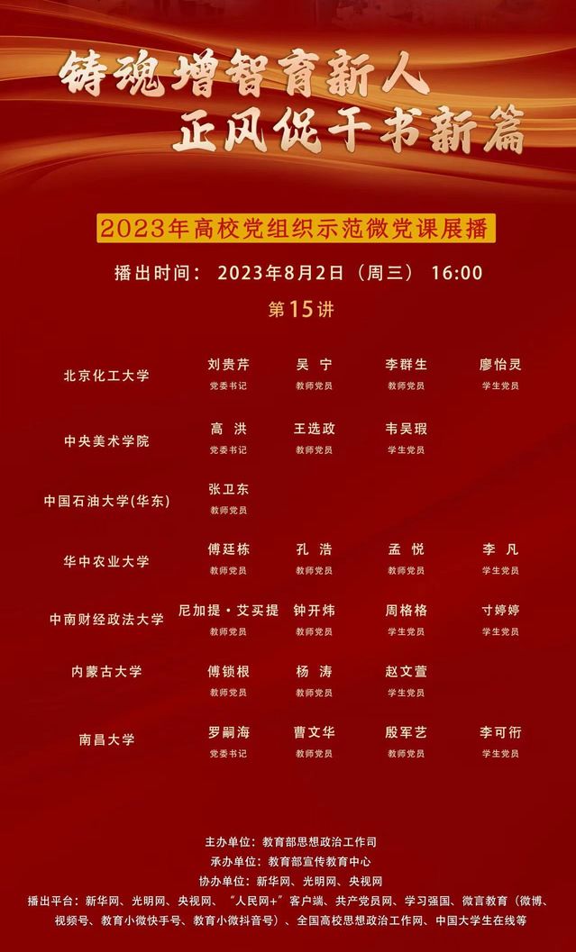 新闻网讯(通讯员 董晓清 张黎明)8月2日,我校参加教育部思想政治工作司、教育部宣传教育中心开展的2023年高校党组织示范微党课展播活动,新华网、光明网、央视网、共产党员网、微言教育、高校思政网等16个平台作了直播。